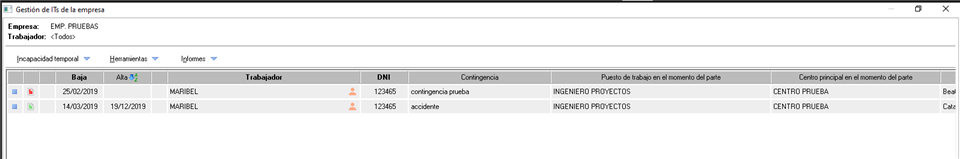 Al acceder al apartado de Incapacidad temporal de una empresa, puede ver todos los registros de IT de la empresa o editar y crear nuevos: