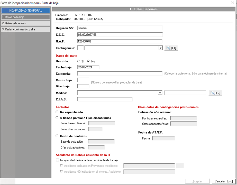 Los datos Régimen SS y C.C.C, prevengos los cumplimenta de los datos obtenidos de la ficha de la empresa y el campo N.A.F. lo vuelca de la ficha del trabajador. No obstante, si en la ficha de la empresa o del trabajador no tuviera alguno de ellos, al crear una nueva IT los campos que no pudiera obtener estarían en blanco y tendría que cumplimentarlos en la ficha de la IT para poder registrarla.