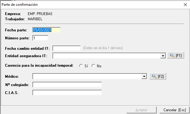 Por último, deberá indicar el médico seleccionandolo del listado del mantenimiento de médicos y pulsar aceptar para que se grabe el parte de confirmación.
