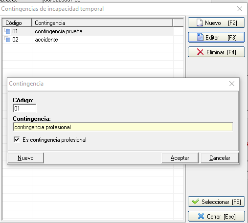 y crear las contingencias que necesite o editarla. Si la contigencia es considerada profesional, debe indicarlo en el mantenimiento, editando el tipo de contingencia y marcando el check 'Es contingencia profresional'.