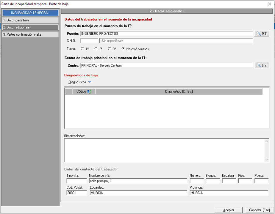 En el siguiente apartado podemos registrar los partes de confirmación de la IT, tenga en cuenta que en cuanto cree el primer parte de confirmación los datos de las pestaña 1. Datos parte baja y 2. Datos adicionales se quedarán en solo lectura, excepto los campos 'Diagnóstico' y 'Observaciones' que seguirán siendo editables. Solo se quedarán en solo lectura al marcar 'alta médica'.