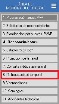 Desde dentro de la ficha del trabajador, también puede acceder a su registro de IT, dentro del apartado 'Areas específicas' pinchando en 'Medicina del trabajo->IT. Incapacidad temporal'
