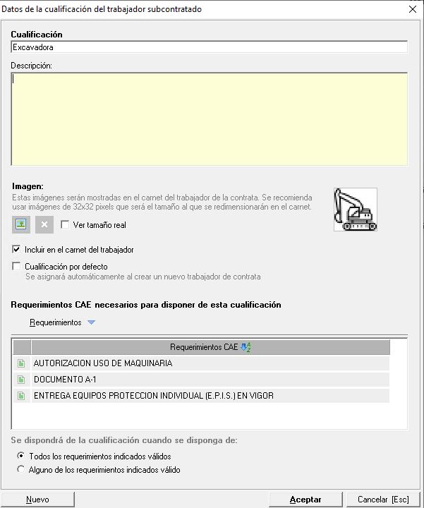 Como podemos apreciar, tenemos un primer campo donde establecemos el nombre de la cualificación seguido de una descripción de la misma. A continuación, podemos establecer una imagen asociada a dicha cualificación, la cual puede ser incluida en el carnet de acceso del trabajador si marcamos la opción "Incluir en el carnet del trabajador".