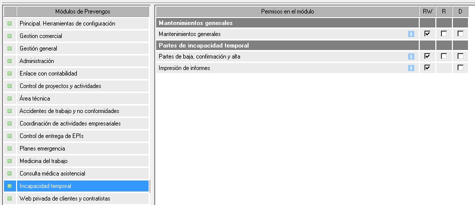 Gestiona el acceso a [IT. Incapacidad temporal] dentro del área de Vigilancia de la salud de la empresa o en el módulo de accidentes. Con |RW| el usuario puede crear/editar/eliminar partes de incapacidad temporal, con |R| el acceso es de solo lectura sin poder modificar datos y con |D| la herramienta esta deshabilitada.
