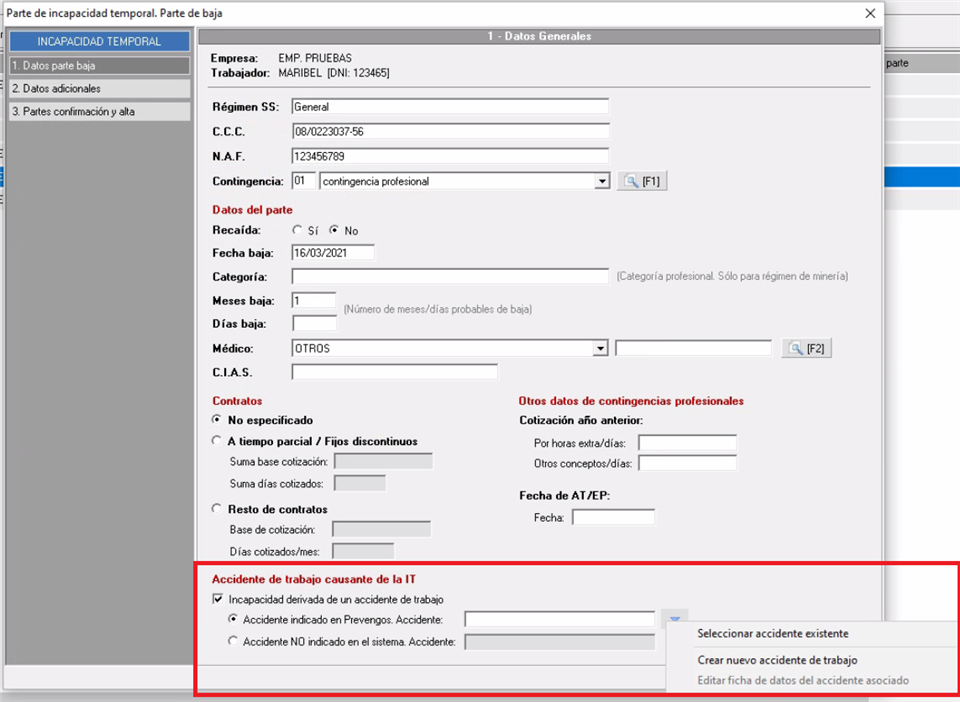 Desde el módulo de accidentes, también puede crear una IT vinculada a un accidente. Aunque esto se explicará con más detalle en los manuales de accidentes, indicarle que desde la ficha de registro de un accidente, el punto de lesiones sufridas, puede marcar que el accidente causa baja y puede crear una IT para que quede vinculada.