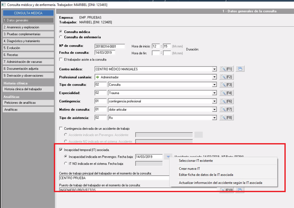 Una consulta médica también puede ser vinculada a una incapacidad temporal. Para ello, debe vincularlo desde la ficha de la consulta médica.