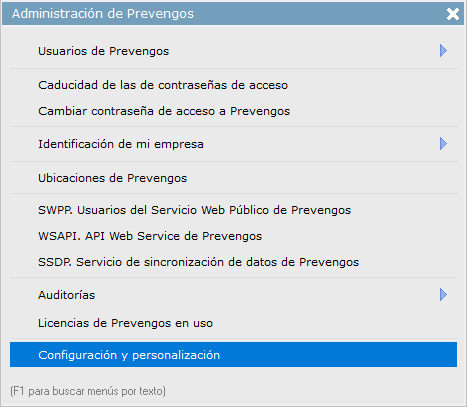 Para acceder al formulario Herramientas de configuración de Prevengos, y el bloque CONFIGURACIÓN DE ENVÍO DE CORREO ELECTRÓNICO CON PREVENGOS, use el menú Configuración > Configuración y personalización: