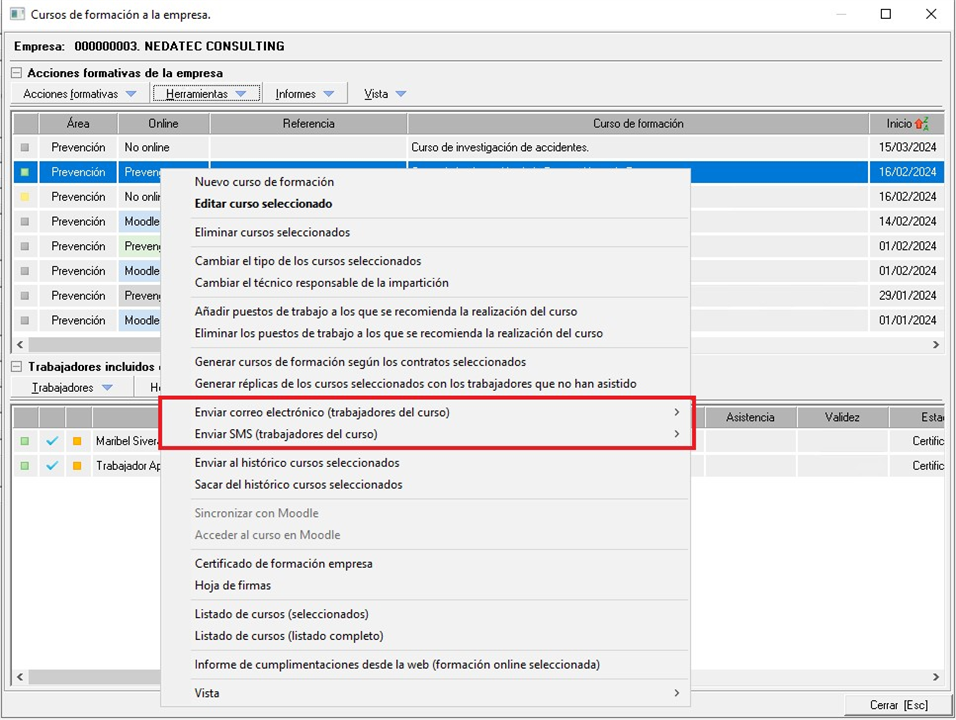 Una vez generamos un curso de formación en la empresa, sea online o presencial, disponemos de diferentes herramientas para enviar notificaciones a los trabajadores. Estas herramientas las tenemos disponibles desde el desplegable Herramientas y en el panel de formación de la empresa al hacer clic sobre el curso con el botón derecho tal y como vemos en la siguiente imagen: