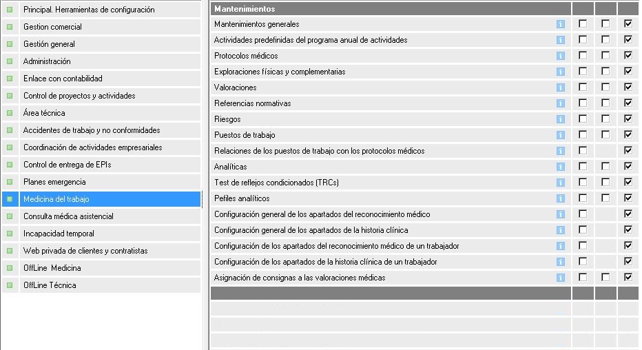 A continuación vemos una imagen con todos los permisos que forman parte de los mantenimientos en el área médica: