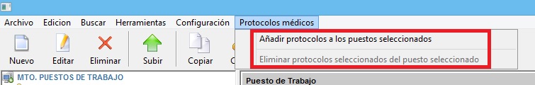 Gestiona el acceso a [Añadir protocolos a los puestos seleccionados] y [ Eliminar protocolos seleccionados del puesto seleccionado] presentes en el mantenimiento de [Puestos de trabajo] ubicados en el menú superior [Protocolos médicos]- Con RW se habilitan las herramientas mientras que con D quedan deshabilitadas. En la siguiente imagen vamos las dos herramientas, dentro del mantenimiento de puestos de trabajo, a las que afecta este permiso: