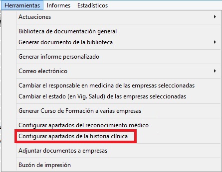 Administra el acceso a [Configurar apartados de la historia clínica] ubicado en el menú [Herramientas] de Vigilancia de la salud. Con RW el usuario puede acceder a la herramienta, quedando el acceso denegado con D. En la siguiente imagen vemos la herramienta que afecta este permiso: