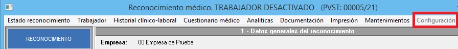 Gestiona que el usuario pueda configurar los apartados del reconocimiento médico de un trabajador en concreto desde el menú superior [Configuración] del propio reconocimiento. Con RW se habilitan las herramientas, quedando deshabilitadas con D. En la siguiente imagen mostramos la ubicación de la herramienta a la que afecta este permiso: