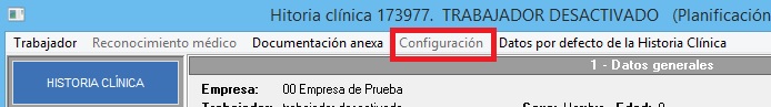 Gestiona que el usuario pueda configurar los apartados de la historia clínica de un trabajador en concreto desde el menú superior [Configuración] del propio reconocimiento. Con RW se habilitan las herramientas, quedando deshabilitadas con D. En la siguiente imagen mostramos la ubicación de la herramienta a la que afecta este permiso: