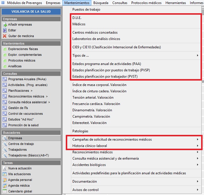 Gestiona el acceso a algunos mantenimientos que no tienen permiso especifico, como puede ser el de DUE, Médicos, Centros médicos concertados, Laboratorios,… Con RW el usuario puede crear/editar/eliminar elementos, con R el acceso es solo lectura sin poder modificar datos y con D el acceso es denegado.
