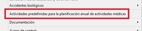 Gestiona el acceso a [Actividades predefinidas para la planificación anual de actividades médicas] ubicado en el menú superior [Mantenimientos] de Vigilancia de la salud. Con RW el usuario puede crear/editar/eliminar elementos, con R el acceso es solo lectura sin poder modificar datos y con D el acceso es denegado. En la siguiente imagen podemos comprobar el mantenimiento al que permite el acceso este permiso: