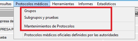 Gestiona el acceso a [Grupos], [Subgrupos y pruebas] y [Mantenimiento de Protocolos] ubicado en el menú superior [Protocolos médicos] de Vigilancia de la salud. Con RW el usuario puede crear/editar/eliminar elementos, con R el acceso es solo lectura sin poder modificar datos y con D el acceso es denegado. En la siguiente imagen podemos ver los mantenimientos afectados por este permiso: