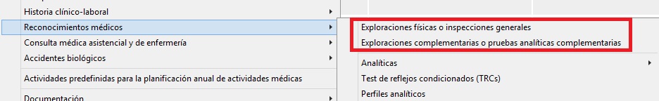 Gestiona el acceso a [Exploraciones físicas o inspecciones generales] y [Exploraciones complementarias o pruebas analíticas complementarias] ubicado en la carpeta [Reconocimientos Médicos] del menú superior [Mantenimientos] en Vigilancia de la salud. Con RW el usuario puede crear/editar/eliminar elementos, con R el acceso es solo lectura sin poder modificar datos y con D el acceso es denegado. En la siguiente imagen podemos ver de manera más visual los dos mantenimientos a los que afecta este permiso: