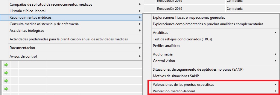 Gestiona el acceso a los mantenimientos de las [Valoraciones de las pruebas específicas] como son Espirometría, antropometría, estudio carotideo y riesgo cardiovascular. También la [Valoración médico-laboral] dentro de [Valoración médico-laboral], todas dentro de [Reconocimientos Médicos] en el menú superior [Mantenimientos]. Con RW el usuario puede crear/editar/eliminar elementos, con R el acceso es solo lectura sin poder modificar datos y con D el acceso es denegado. En la siguiente imagen podemos ver los dos conjuntos de mantenimientos a los que afecta este permiso: