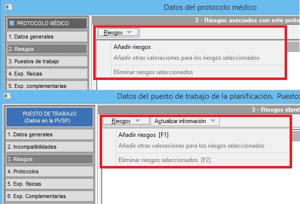 Gestiona el acceso al mantenimiento de [Riesgos], el cual se accede en lugares como protocolos médicos o al editar puestos de una PVSP. Con RW el usuario puede crear/editar/eliminar elementos, con R el acceso es solo lectura sin poder modificar datos y con D el acceso es denegado. En la siguiente imagen vemos dos ejemplos en donde se accede al mantenimiento de riesgos, ya que a fecha de hoy este mantenimiento no es accesible desde la pantalla principal del módulo:
