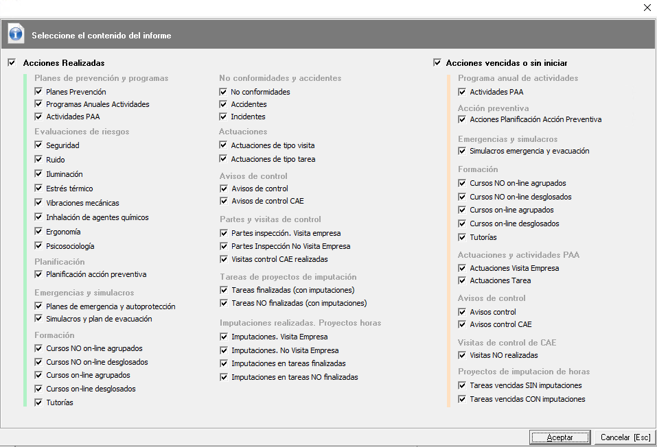 Una vez establecidas las fechas y los técnicos, la siguiente pantalla es una selección del contenido a incluir en el documento de la memoria. Se divide en acciones realizadas (verde) y acciones vencidas o no iniciadas (beige), las cuales corresponden a informes independientes, es decir, se generará un informe para las acciones realizadas y otro para las acciones vencidas.