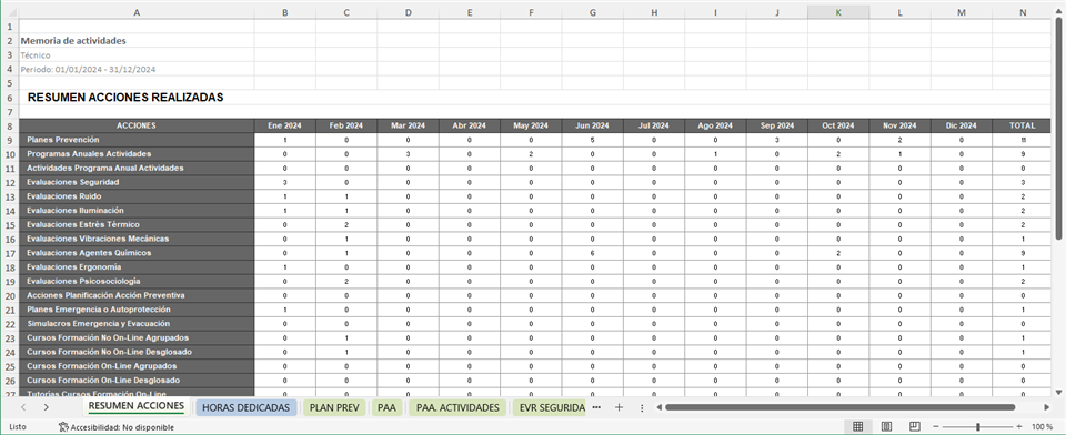 Una vez generada la memoria se incluirá una hoja de Excel "RESUMEN ACCIONES" a la que le acompañarán más hojas, en función de lo que se haya seleccionado en la pantalla de opciones anterior. Por ejemplo, aparecerá un listado de evaluaciones de seguridad y de partes de visita si se ha seleccionado "Seguridad" en el bloque de "Evaluaciones de riesgos" y "Partes de inspección. Visita empresa" del bloque "Partes y visitas de control".