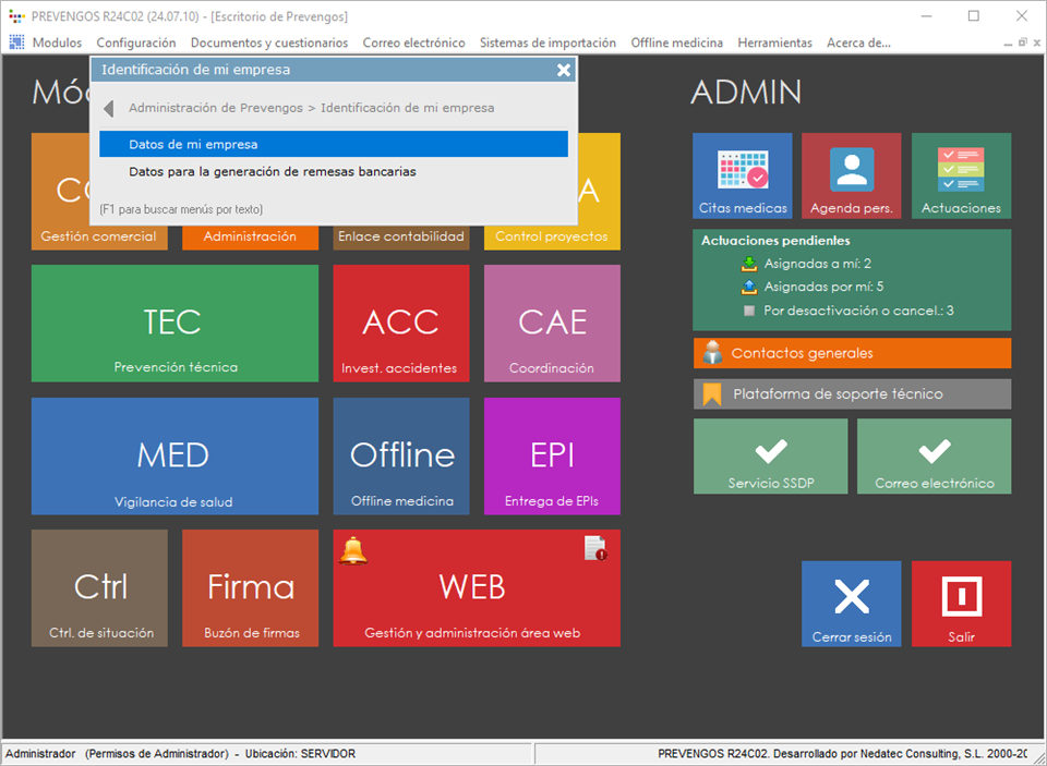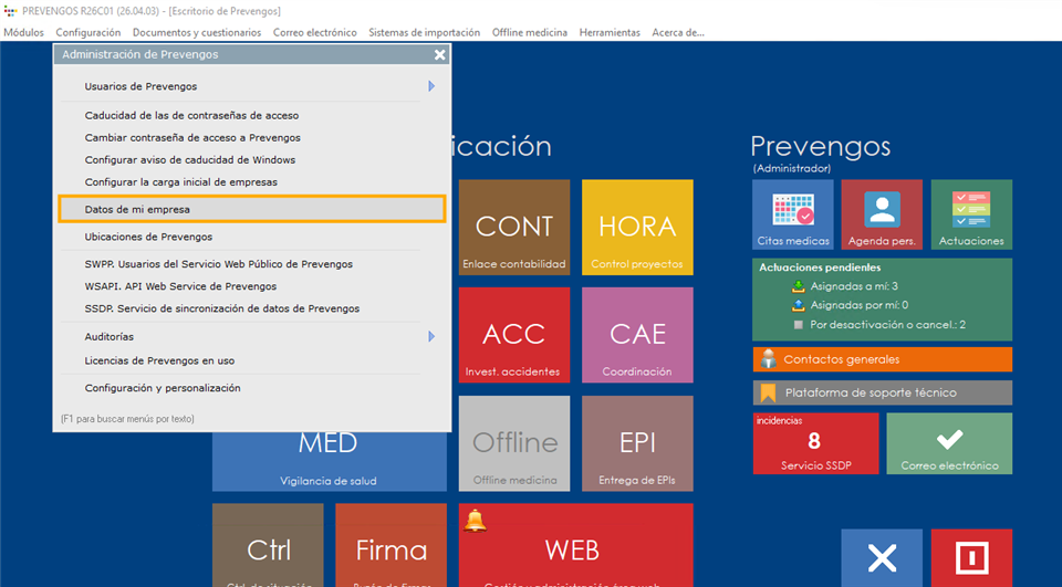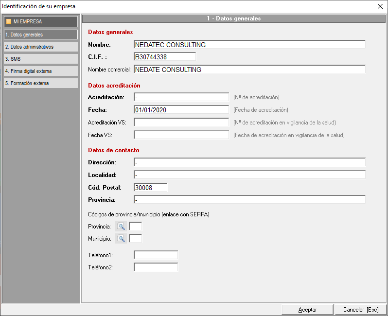 Indicará los datos de contacto de la sede principal del servicio de Prevención, así como la codificación de provincia y municipio que usa Prevengos para generar los fichero de conexión con SERPA, comunicación de contratos y memoria Orden TIN.