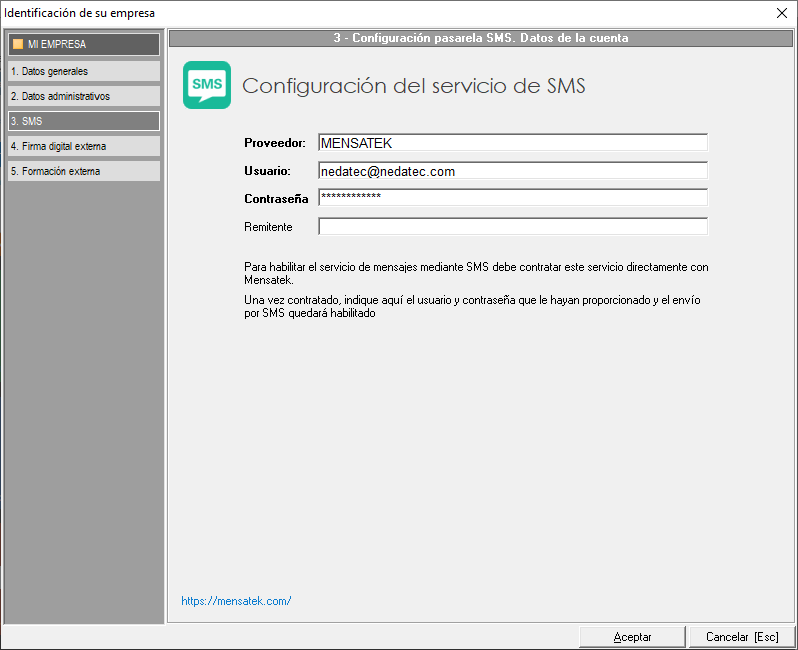 Para habilitar el envío de SMS desde el aplicativo debe contratar el saldo con MENSATEK, servicio ajeno a Prevengos, e indicar los datos de acceso a su web en los campos Usuario y Contraseña. Remitente será la información que tendrá el receptor del SMS en su teléfono.