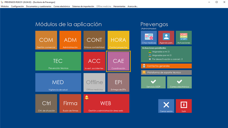 Cuando acceden a Prevengos visualizan el escritorio de la aplicación en el que se encuentran accesos directos a todos los módulos de la aplicación. Entre estos accesos directos se encuentra el del módulo dedicado a la Coordinación de Actividades Empresariales (CAE), representado por un rectángulo de color rosa con las siglas 'CAE' que les da acceso a este módulo. En este manual vamos a realizar una introducción general de este módulo.
