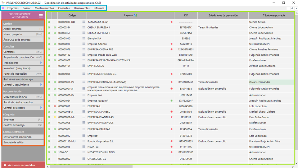 En la parte superior, destacado dentro de un cuadro azul dispone de la barra de menús desplegables, en la parte central destacado con un cuadro verde dispone del listado de empresas que se han incorporado en el módulo CAE y en la columna lateral izquierda destacado con un cuadro naranja dispone de accesos directos a gestión de empresas, mantenimientos, consultas, buscadores, herramientas e informes.