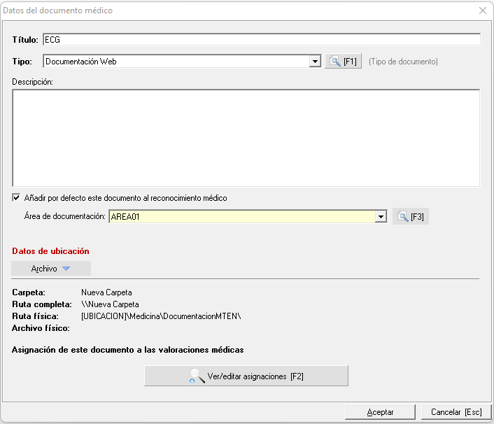 En la parte inferior de esta pantalla se encuentra el botón 'Ver/Editar asignaciones', este botón aparece en la mayoría de mantenimientos del área médica y se utiliza tanto, para ver que donde está relacionado el documento que estamos mostrando, como para asignar nuevas relaciones con las valoraciones de las pruebas y exploraciones.