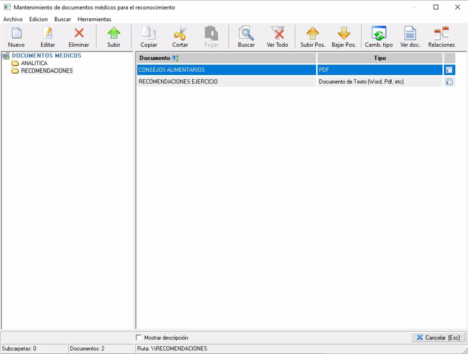 Este mantenimiento es igual al anterior, ya que simplemente es para crear los distintos apartados en los cuales quiere clasificar los documentos, pero en este caso, para anexarlos al reconocimiento médico.