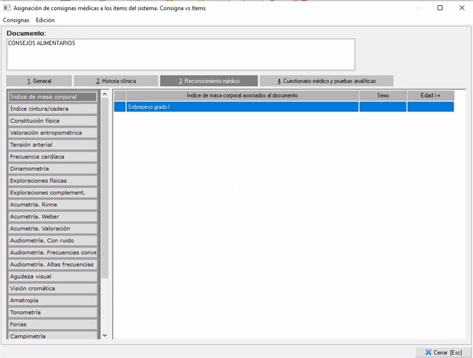 Por ejemplo, si va a la pestaña 3. Reconocimiento médico y pincha en 'Indice de masa corporal' puede comprobar que 'Sobrepeso grado I' tiene vinculado el docuemento de CONSEJOS ALIMENTARIOS; además puede asignar más resultados a este documento con el botón derecho 'Añadir nuevas relaciones' o editar la relación para definir para que sexo o edad quiere añadirle este documento. Por tanto, si en un reconocimiento el trabajador obtiene una valoración de Sobrepeso grado I, si va al apartado de documentación adjunta al reconocimiento y utiliza la herramienta 'Añadir documentos automatizados' le cargará este documento.