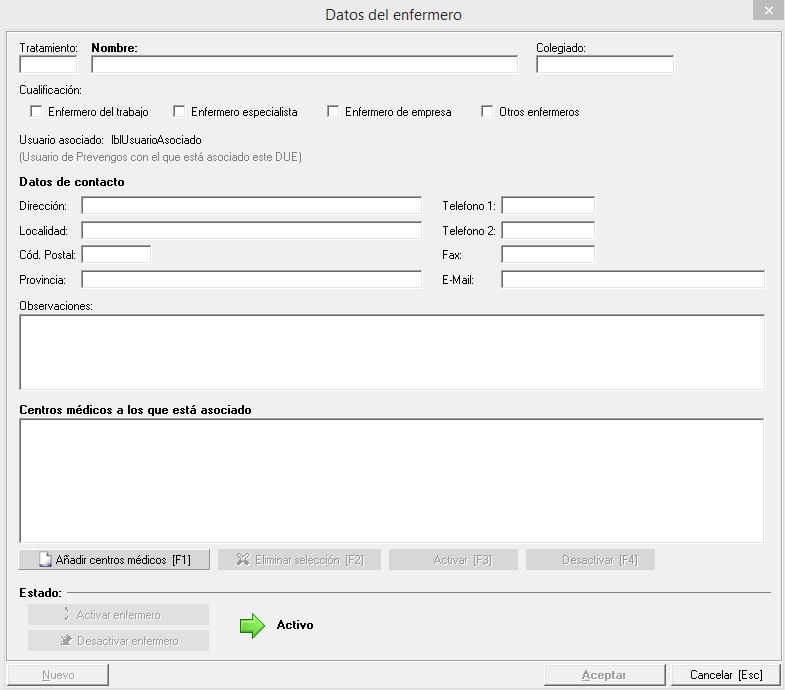 Al acceder al mantenimiento, nos aparece una ventana con el listado de enfermeros que tengamos ya creados, si procede, y como es normal en los mantenimientos disponemos de las herramientas para crear, editar y eliminar elementos en el desplegable "Edición". Si seleccionamos la opción para crear un nuevo enfermero se muestra una ventana similar a esta: