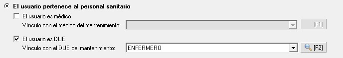 Como vimos en el manual de creación de usuario, establecemos esa vinculación en la pantalla de creación de usuarios, marcando la opción 'el usuario pertenece al personal sanitario' y eligiendo a que DUE del mantenimiento corresponde, tal y como vemos en la siguiente imagen: