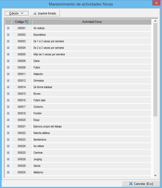 En este mantenimiento daremos de alta todas las actividades físicas que queremos tener disponible para añadir dentro de una historia clínica. Como en todos los mantenimientos, tenemos disponible las opciones necesarias, en el desplegable Edición, para crear, editar y/o eliminar elementos. La pantalla principal del mantenimiento es similar a esta: