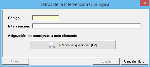 Vemos un listado de todas las intervenciones quirúrgicas dadas de alta en el mantenimiento, en caso de que queramos crear una nueva, o editar una existente, la venta que veremos es similar a la siguiente:
