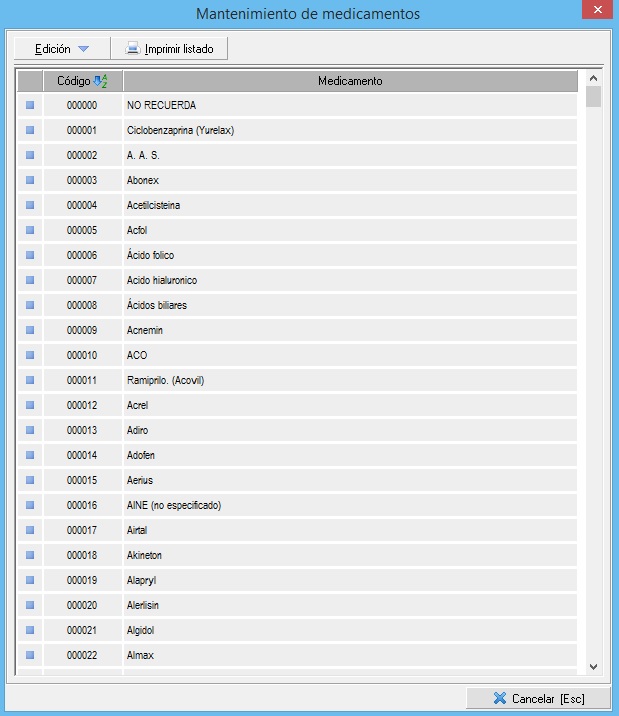 En este mantenimiento daremos de altas todas los medicamentes que queremos tener disponible para añadir dentro de una historia clínica. Como en todos los mantenimientos, tenemos disponible las opciones necesarias, en el desplegable Edición, para crear, editar y/o eliminar elementos. La pantalla principal del mantenimiento es similar a esta:
