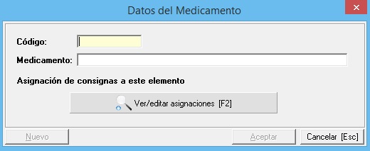 Debemos establecerle un código que puede ser alfanumérico pero indispensable que sea único, es decir, que no esté establecido en otro medicamento, no se puede repetir. Describiremos el medicamento y podemos establecer unas consignas con el fin de que sean aplicadas automáticamente. Para más información sobre las asignación, vaya al manual de mantenimiento de consignas