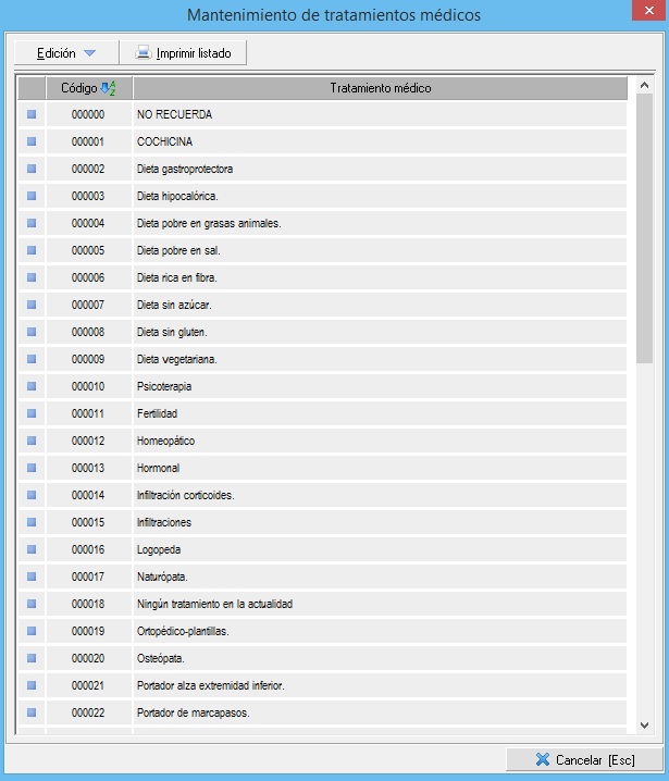 En este mantenimiento daremos de alta todos los tratamientos médicos que queremos tener disponible para añadir dentro de una historia clínica. Como en todos los mantenimientos, tenemos disponible las opciones necesarias, en el desplegable Edición, para crear, editar y/o eliminar elementos. La pantalla principal del mantenimiento es similar a esta: