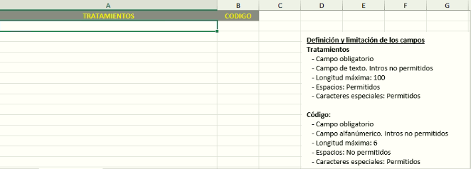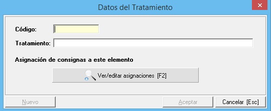 Debemos establecerle un código que puede ser alfanumérico pero indispensable que sea único, es decir, que no esté establecido en tratamiento médico, no se puede repetir. Describiremos el tratamiento y podemos establecer una consignas con el fin de que sean aplicadas automáticamente. Para más información sobre las asignación, vaya al manual de mantenimiento de consignas