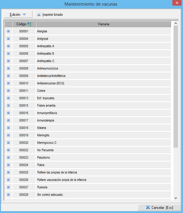 En este mantenimiento daremos de altas todas las vacunas que queremos tener disponible para añadir dentro de una historia clínica. Como en todos los mantenimientos, tenemos disponible las opciones necesarias, en el desplegable Edición, para crear, editar y/o eliminar elementos. La pantalla principal del mantenimiento es similar a esta: