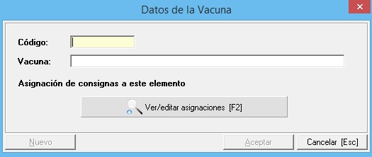 Debemos establecerle un código que puede ser alfanumérico pero indispensable que sea único, es decir, que no esté establecido en otra vacuna, no se puede repetir. Describiremos la actividad y podemos establecer una consignas con el fin de que sean aplicadas automáticamente. Para más información sobre las asignación, vaya al manual de mantenimiento de consignas