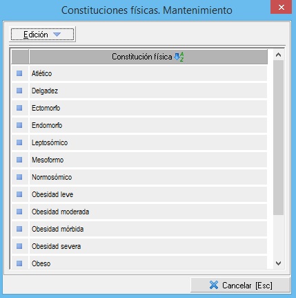 En este mantenimiento establecemos todas las constituciones físicas que tendremos disponible para asignarselas al trabajador en su historia clínica. Como en el resto de mantenimientos, disponemos de las opciones necesarias para crear, editar y eliminar elementos. La ventana es similar a la siguiente: