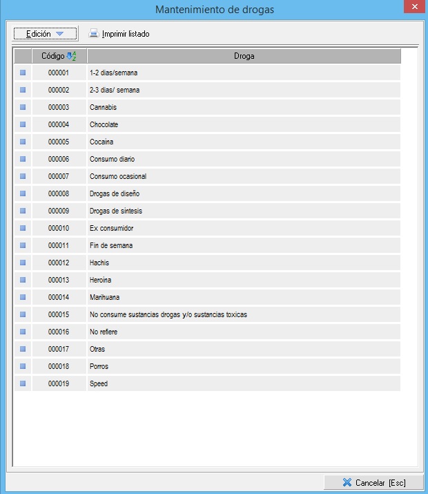 Vemos un listado de las drogas ya creadas en el mantenimiento, en caso de que queramos crear una nueva, o editar una existente, la ventana que veremos es similar a la siguiente: