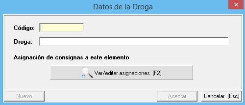 Debemos establecerle un código que puede ser alfanumérico pero es indispensable que sea único, es decir, que no esté establecido en otra elemento del mantenimiento, no se puede repetir. Establecemos el nombre de la Droga y podemos establecer una consignas con el fin de que sean aplicadas automáticamente. Para más información sobre las asignación, vaya al manual de mantenimiento de consignas