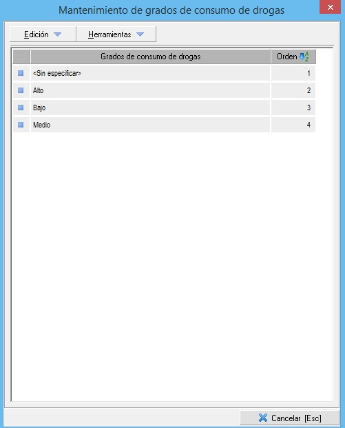 En Prevengos se puede establecer un grado para el consumo de drogas por parte de un trabajador. Este grado viene de un mantenimiento donde podemos crear aquellos elementos que necesitemos a la hora de asignar el consumo. La pantalla principal del mantenimiento es similar a esta:
