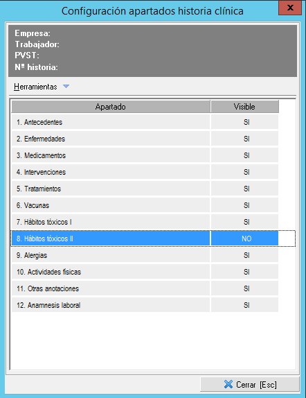 En el menú superior dispone de la configuración de la historia por defecto, esta configuración se utiliza por si quiere ocultar algún apartado en las historias clínicas, este apartado se ocultará por defecto pero en cada una de las historias de los reconocimientos médicos o consultas médicas, lo podrá personalizar.