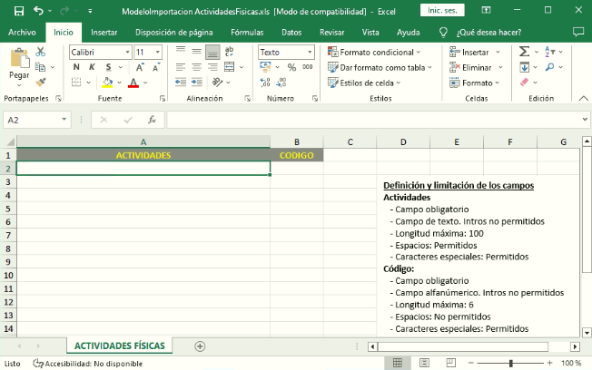 Debemos establecerle un código que puede ser alfanumérico pero indispensable que sea único, es decir, que no esté establecido en otra actividad física, no se puede repetir. Describiremos la actividad y podemos establecer una consignas con el fin de que sean aplicadas automáticamente. Para más información sobre las asignación, vaya al manual de mantenimiento de consignas