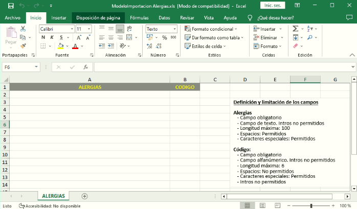 En esta imagen podemos ver que desde el menú desplegable de herramientas podemos obtener la siguiente plantilla de excel para la importación de las alergias al mantenimiento.