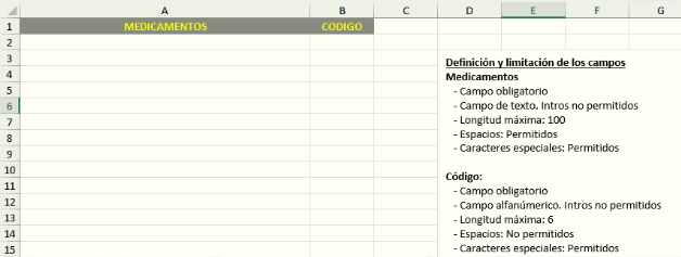 En esta imagen podemos ver que desde el menú desplegable de herramientas podemos obtener la siguiente plantilla de excel para la importación de los medicamentos al mantenimiento.